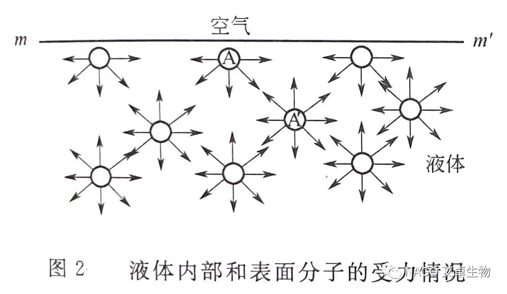 表面張力是由于液體表面范德華力不平衡引起的(如圖2)。在液體內(nèi)部,平均來說分子受到周圍鄰近分子的吸引力是對稱和平衡的;但在液體表面,因為上面氣相中分子的密度很小,它對液體分子的吸引力可以忽略,表面的分子只受到下面液相分子的吸引。結(jié)果,表面的分子總是盡力向液體內(nèi)部擠,從而,使液體表面有張力,有自動收縮的傾向。當(dāng)分子從內(nèi)部移向表面時,必須克服表面分子所受到的指向內(nèi)部的合力作用,故需要供給能量。增加液體的表面積就是把一定數(shù)量的內(nèi)部分子變?yōu)楸砻嫔系木哂休^高能量的分子。為此,外界必須對體系做功,導(dǎo)致體系能量升高。對液體表面自由能做出貢獻的分子間相互作用力隨液體組成和狀態(tài)而異,可以是范德華力的各種成分、氫鍵、金屬鍵等。總之,表面上存在過剩能量和表面張力現(xiàn)象是構(gòu)成界面的兩體相性質(zhì)不同和分子間存在相互作用的結(jié)果。