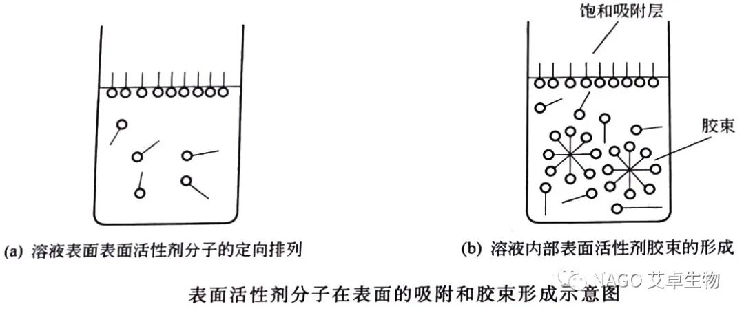 當(dāng)它們在溶液中以很低的濃度溶解分散時,優(yōu)先地吸附在溶液的表面或其他界面上,形成定向排列的表面層。使表面或界面張力(或自由能)顯著降低,改變體系的界面狀態(tài);當(dāng)達到一定濃度時,溶液中締合成膠團,從而直接地產(chǎn)生潤濕或反潤濕、乳化或破乳、起泡或消泡、分散、加溶和洗滌等作用。(如下圖所示)